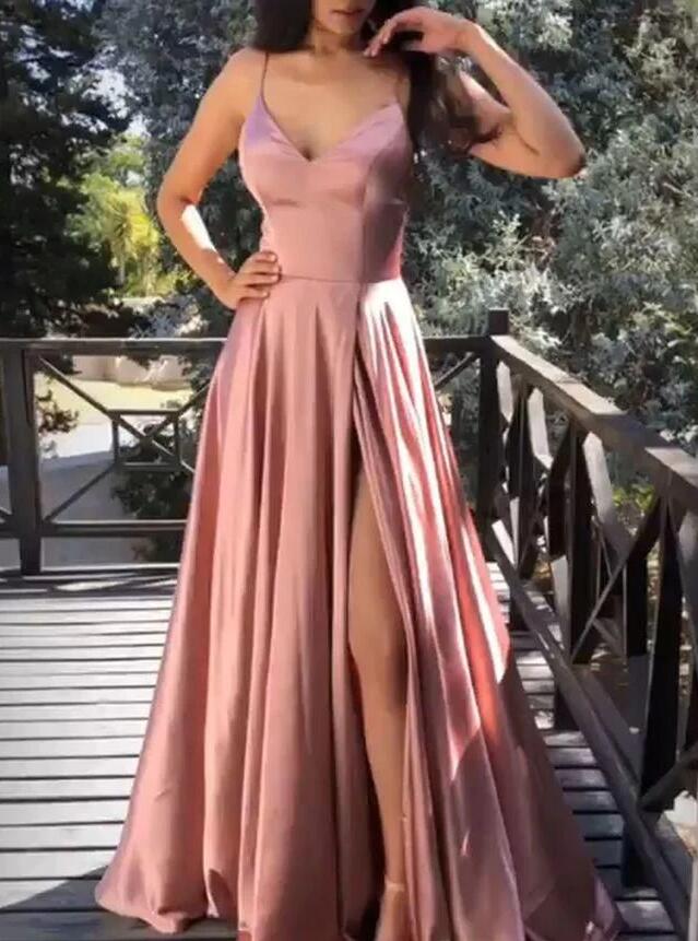 Charming spaghetti straps v-neck pink long evening dresses with side slit