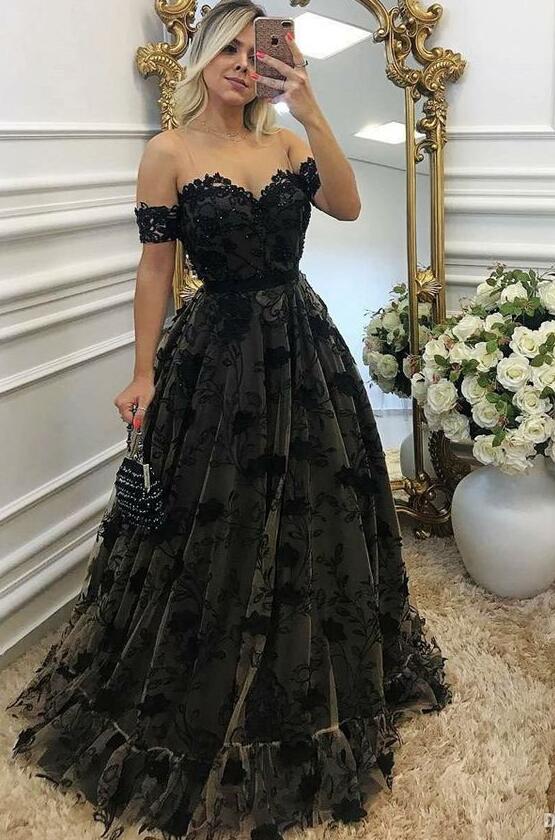 Off-the-Shoulder Black Prom Dress with Lace Appliques
