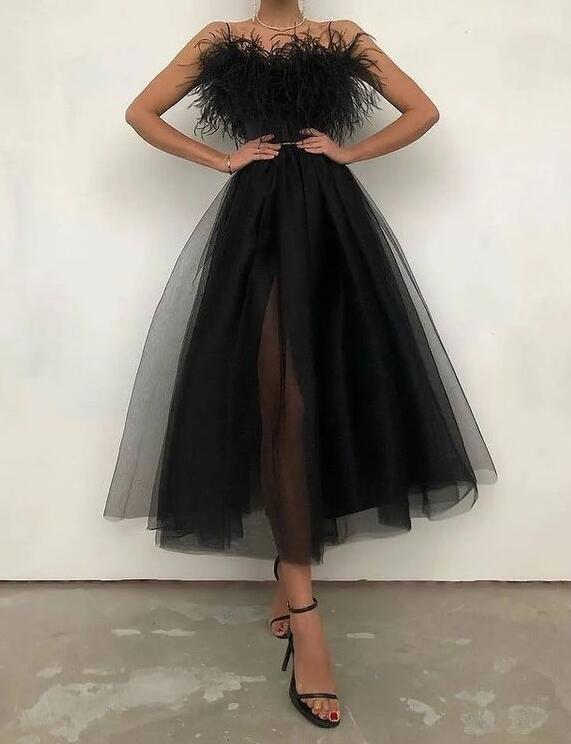 A Line Spaghetti Straps Black Tulle Tea Length Prom Dresses