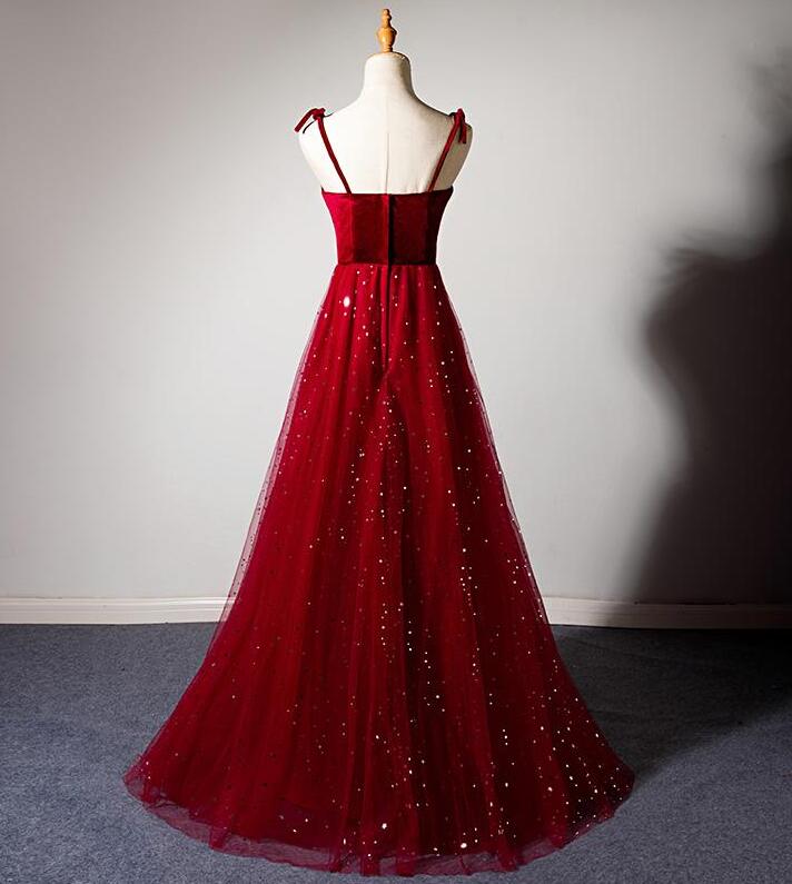 Charming Straps Dark Red Tulle Prom Dress With Top Velvet