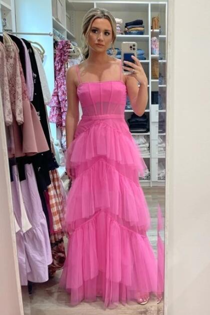 Hot Pink A Line Tulle Tiered Long Prom Dress