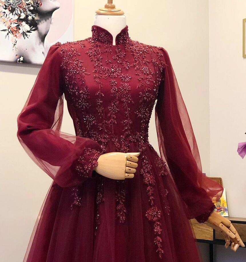A Line High Neck Wine Red Evening Dresses Long Sleeves Prom Dress with lace