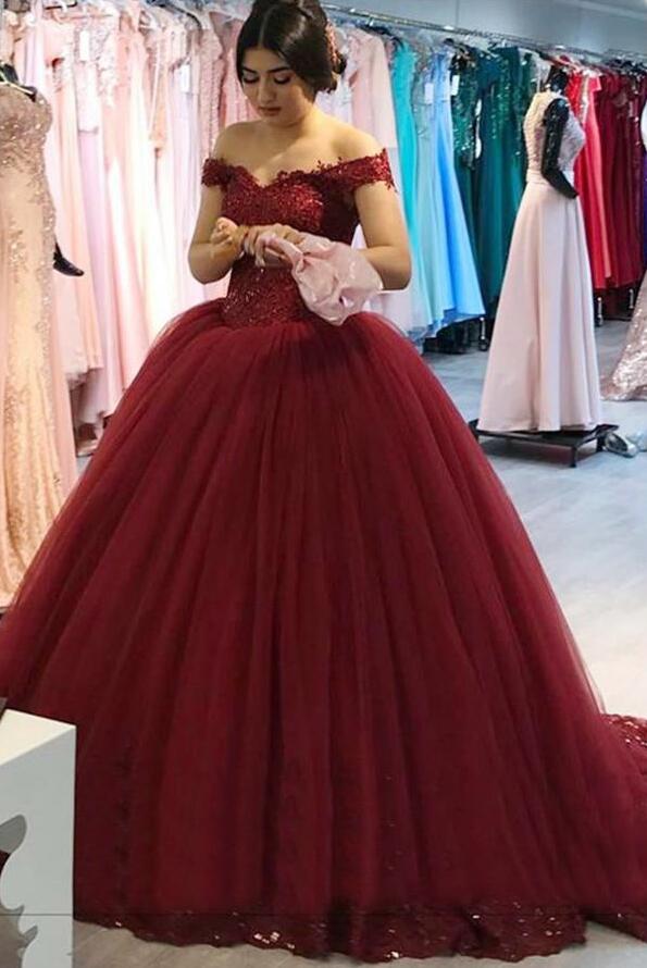 Mermaid Burgundy Ball Gown Off-the-Shoulder Tulle Party Dress with Lace Appliques