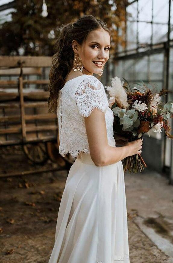 Vintage Two Pieces Country Ivory Lace Wedding Dresses With Short Sleeves