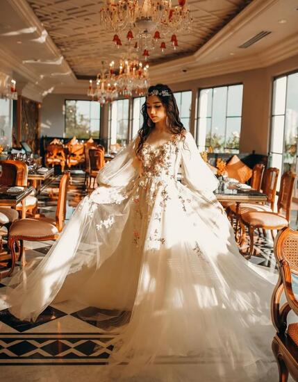 Beautiful Tulle Light Champage Prom Dress With Flowers Pruffy Sleeves