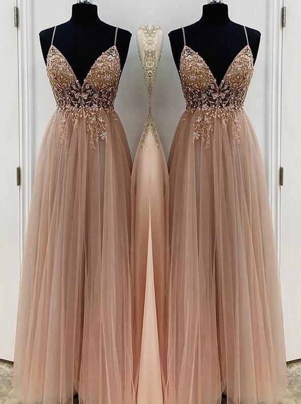 Spaghetti Straps A-Line Beading Tulle Sleeveless Floor-Length Prom Dresses
