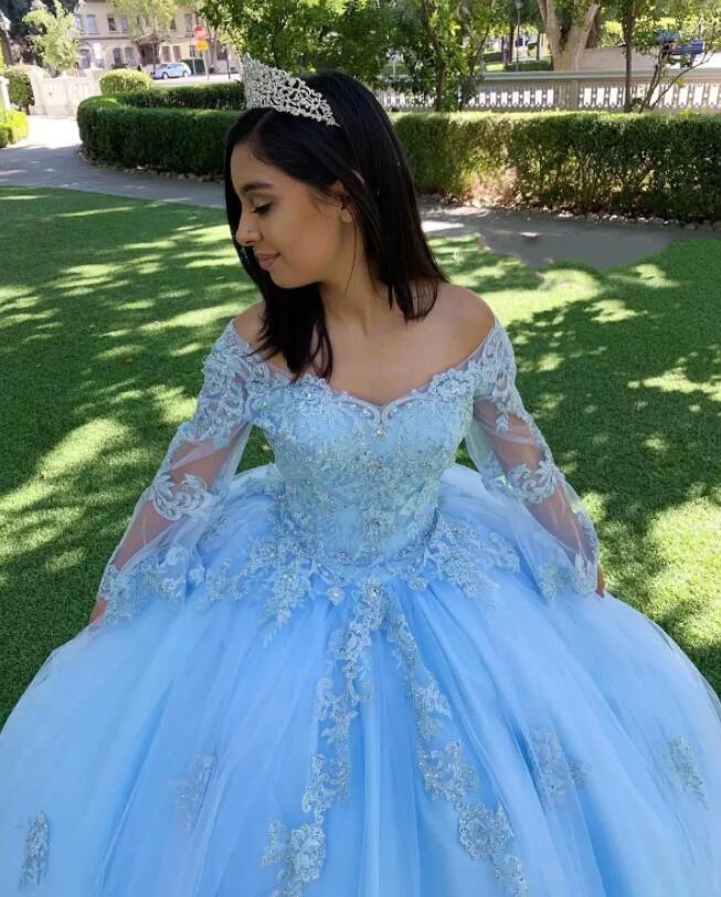 Princess V Neck Long Sleeves Ball Gown Sky Blue Party Dress With Lace Applique Sweet 16 Dress