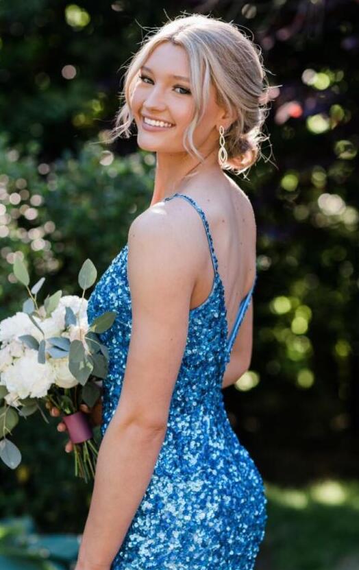 Spaghetti Straps Slit Long V Neck Sequins Prom Dresses