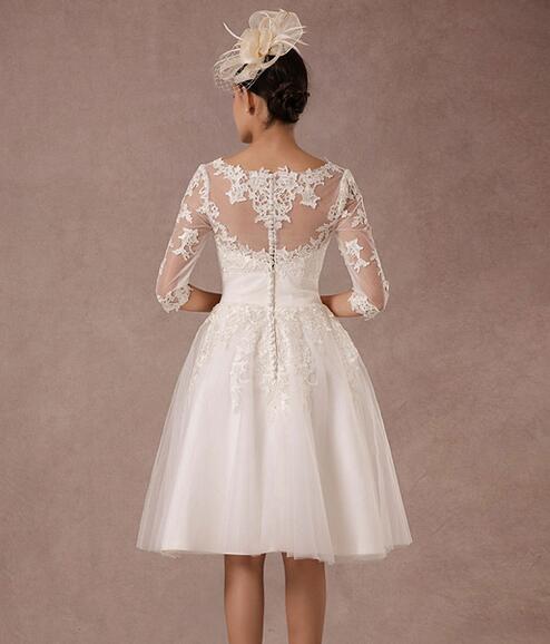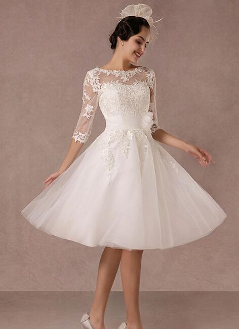 Vintage Long Sleeves Tea Length A-Line Tulle Bridal Dress With Lace Applique