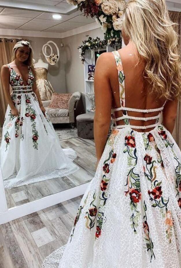 Beautiful V Neck Backless Appliques Long Evening Dresses