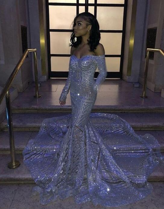 Off the Shoulder Mermaid Sweetheart Sequins Prom Dresses With Long Sleeves