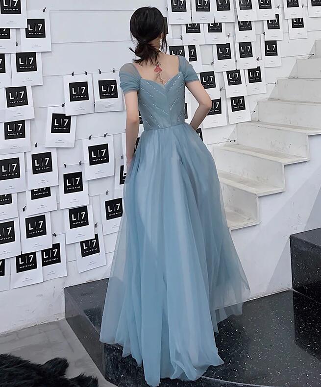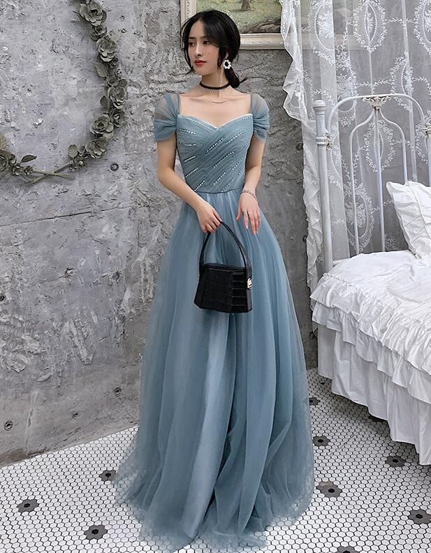 A Line Blue Tulle Long Prom Dresses