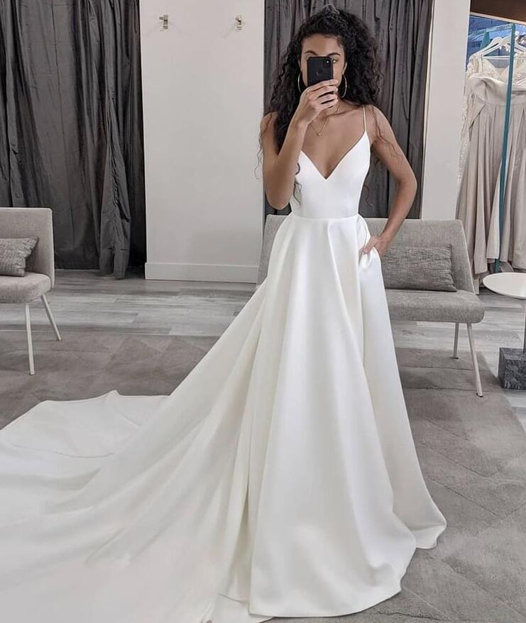 Fashion Straps Mermaid V Neck Satin Prom Dresses with pockets