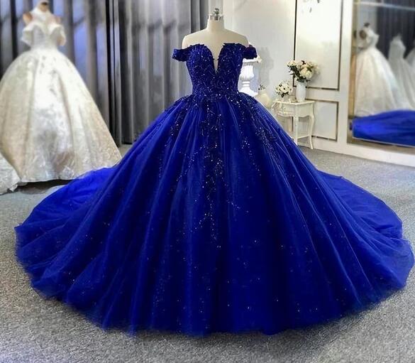 Off Shoulder Ball Gown Royal Blue Long Prom Dresses