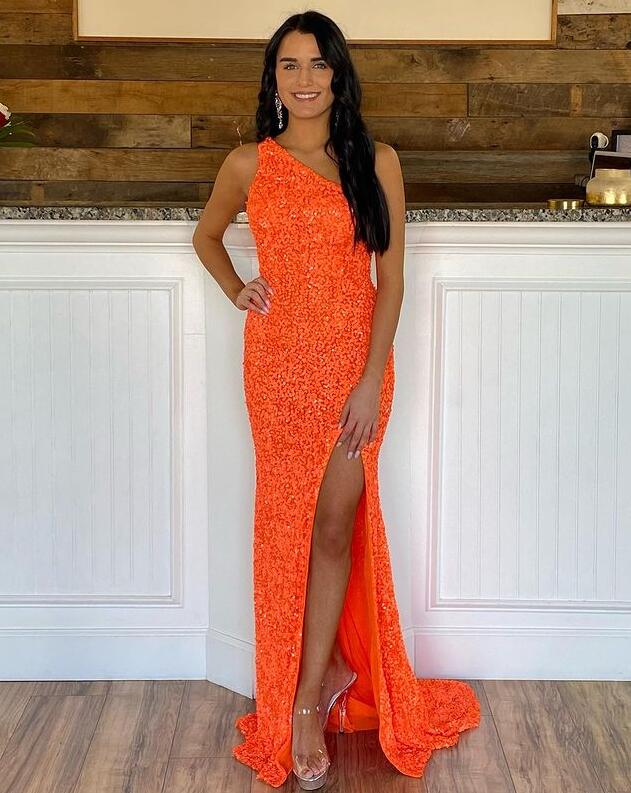 One Shoulder Orange Sequins Long Prom Dresses with Slit