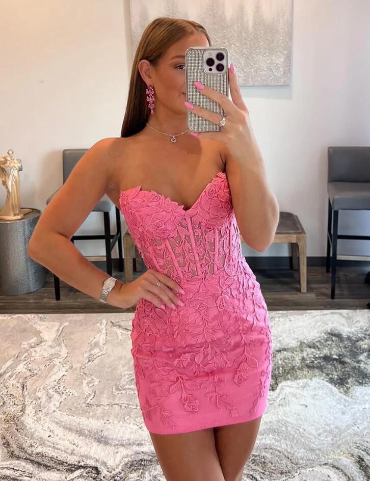 Cute Sweetheart Lace Pink Short Homecoming Dresses