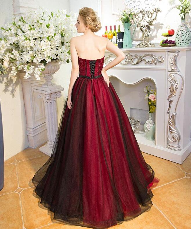 A Line Dark Red and Black Tulle Beaded Long Formal Dresses