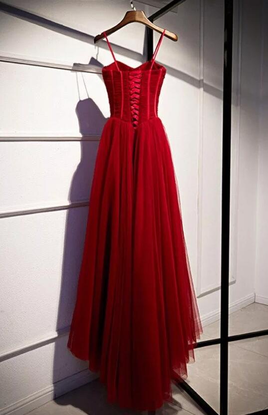 A Line Straps Burgundy Tulle Long Party Dresses