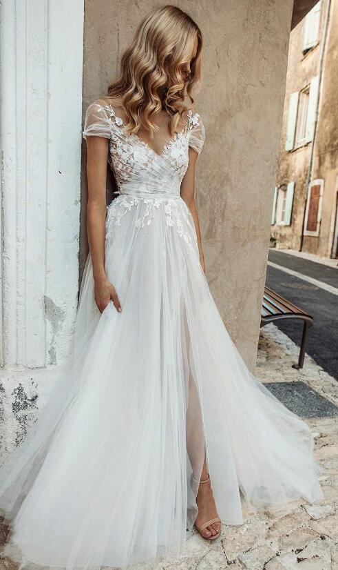 Off the Shoulder Tulle Split Wedding Gown with Applique Lace