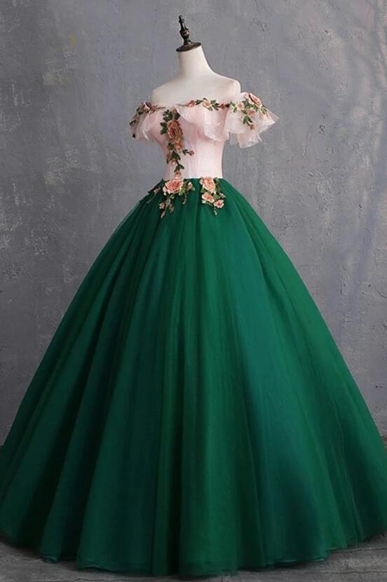 Off Shoulder A Line Green Tulle Prom Dress With Pink Floral