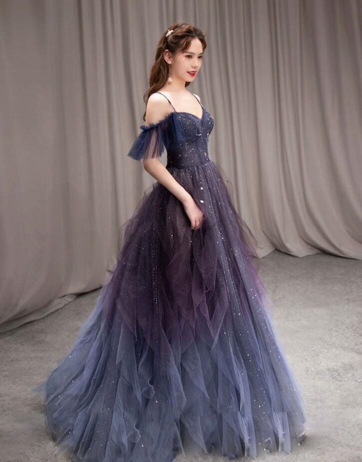 Charming A-line Straps Blue Beaded Tulle Long Formal Dress