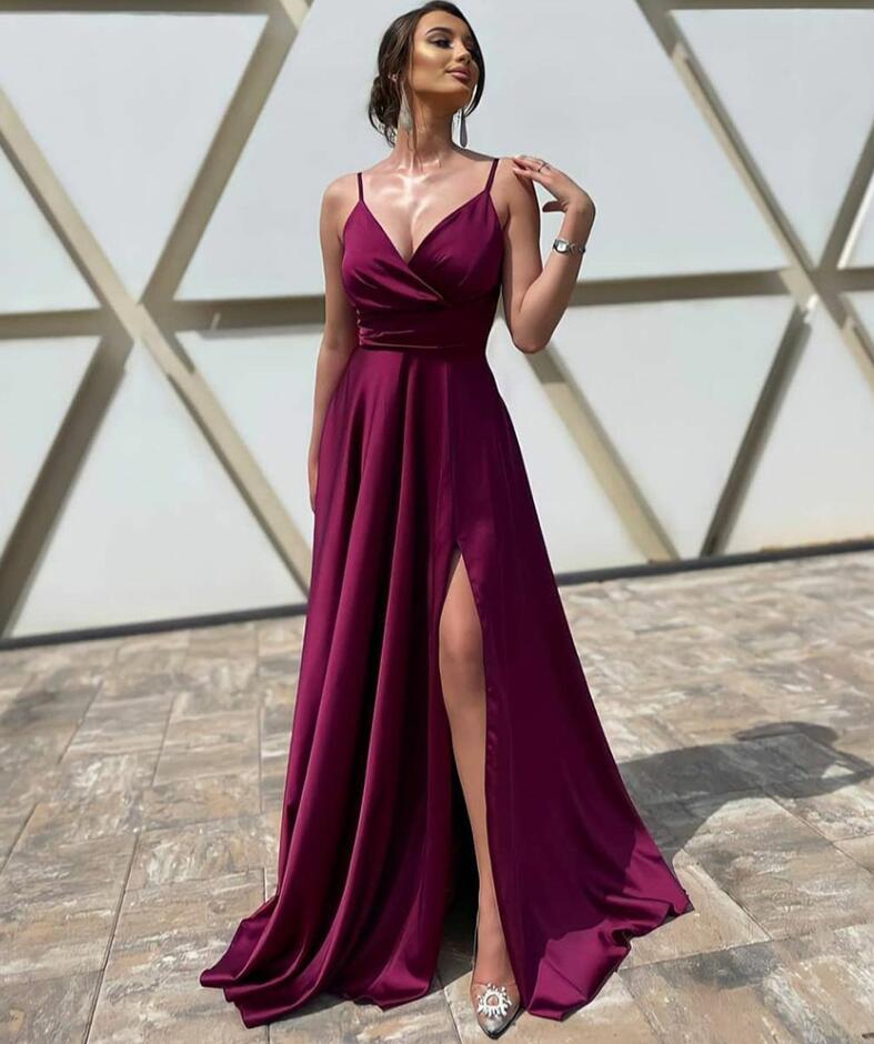 A-Line Burgundy V-Neck Satin Evening Dress With Slit