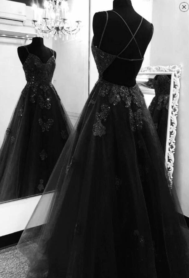 A Line Floor Length Black Tulle Lace Prom Dresses