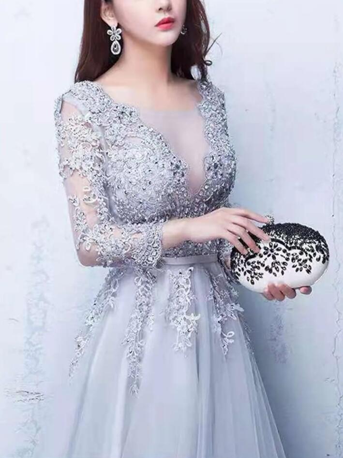 A Line Luxurious Silver Tulle Prom Dress with Appliques