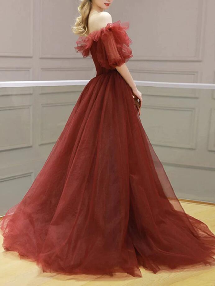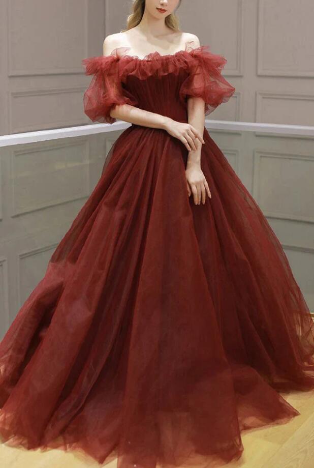 Off Shoulder A Line Burgundy Formal Tulle Long Prom Dress