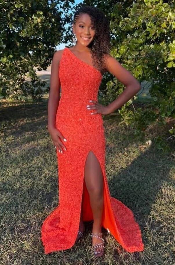 Mermaid One Shoulder Open Back Orange Sequin Long Prom Dress