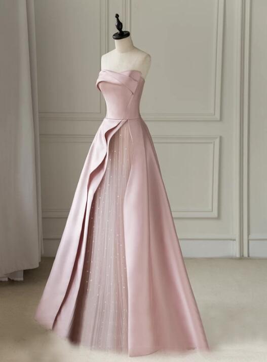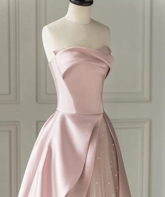 Floor Length Strapless Pink A-Line Satin Prom Dresses