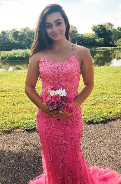 Mermaid bright pink long evening dress with lace appliqued