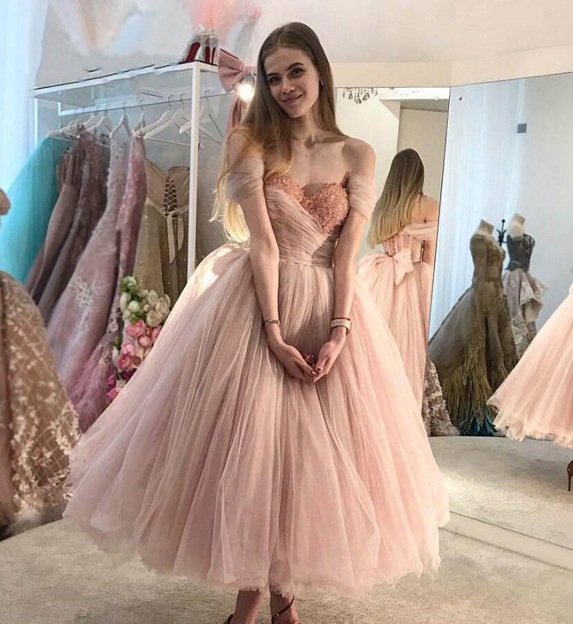 Off the Shoulder Tea Length Pink Long Tulle Prom Dress With Beading