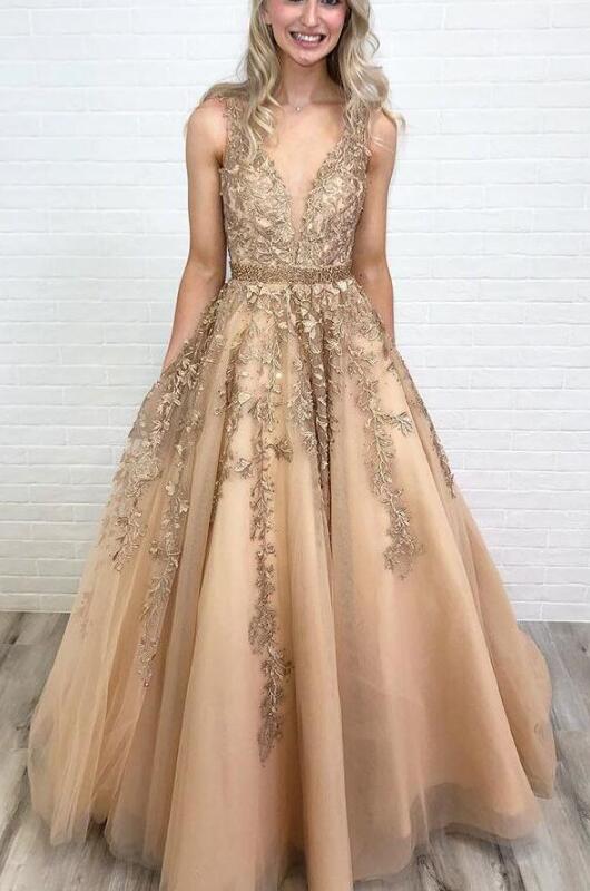 A Line V-neck Long Prom Dress with Appliques and Beading