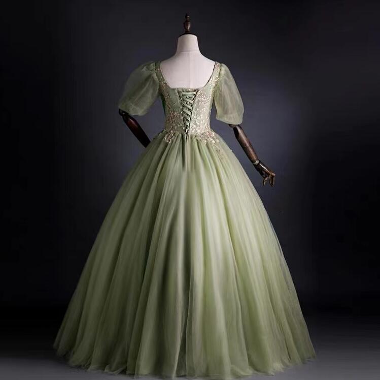 Vintage Ball Gown Green puffed Sleeve Evening Dresses With Lace