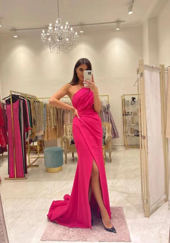 Elegant Hot Pink One Shoulder Split Prom Dresses