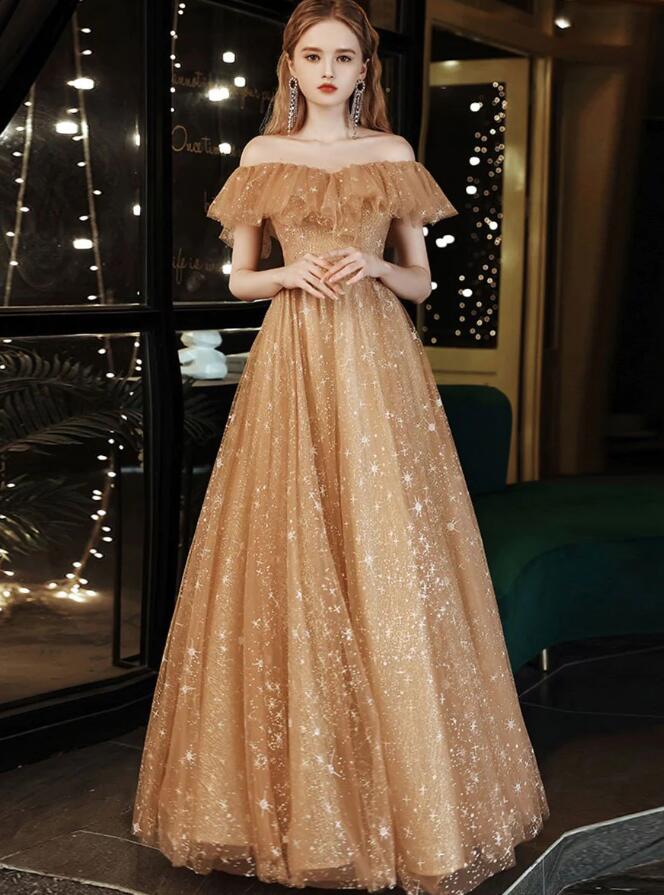 Off Shoulder A Line Gold Tulle Prom Dresses