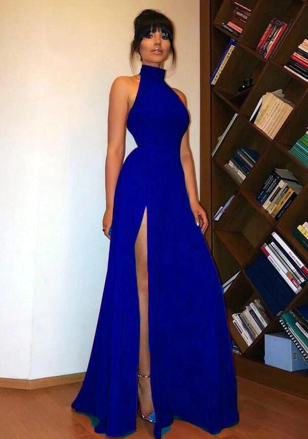 A line blue slit long formal prom dress