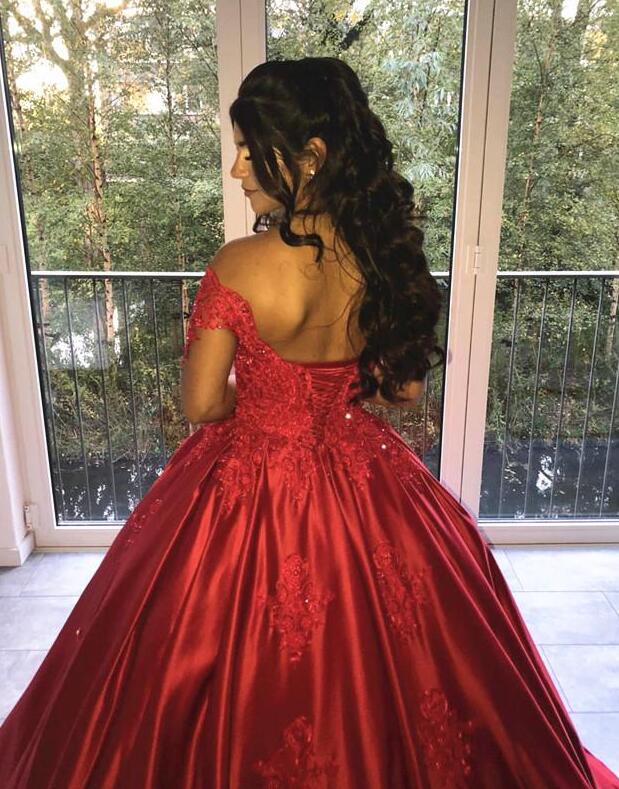 Off Shoulder Burgundy Ball Gown Satin Appliques Prom Dresses