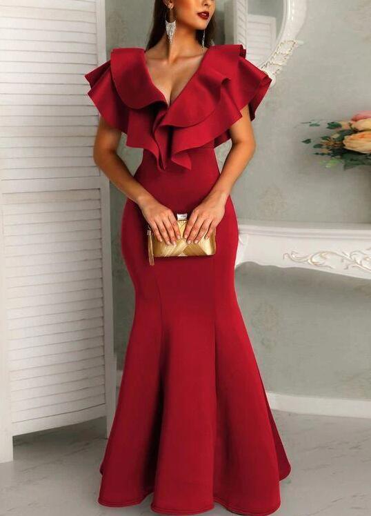 Floor Length A Line Deep V Layered Ruffles Evening Dresses