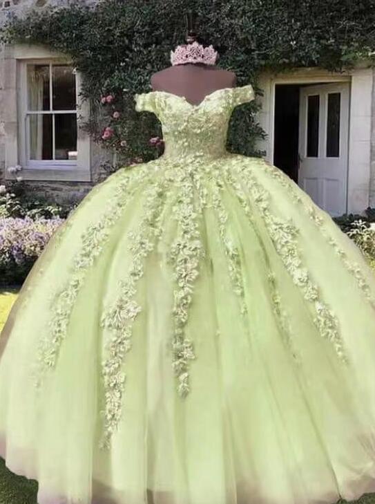 Off Shoulder Light Green Lace Applique Prom Dresses, Pageant Dresses For Women