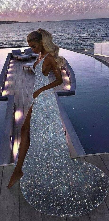 Sexy V-Neck Silver Sequin Long Prom Dresses