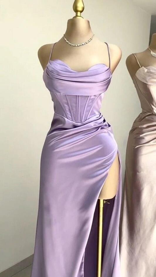 Mermaid Straps Slit Lilac Long Backless Prom Dresses