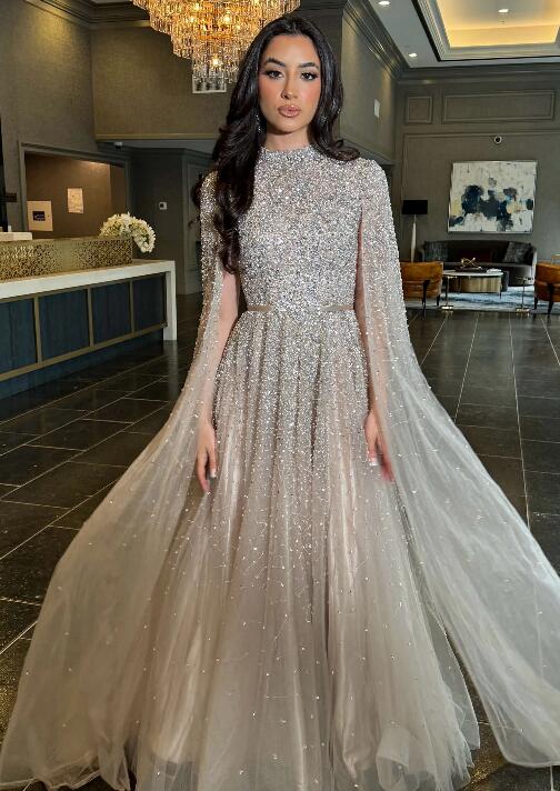 Sexy Modest Long Drape Sleeves Prom Dress with Beaded