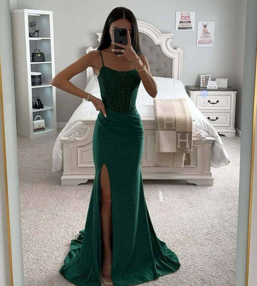 Mermaid Dark Green Sequins Split Evening Dresses for Special Occasions