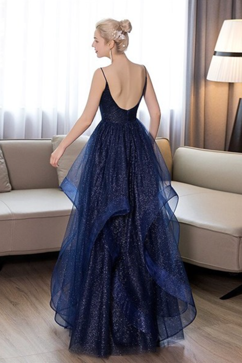 Spaghetti Strap Navy Blue V-Neck Backless Prom Dresses