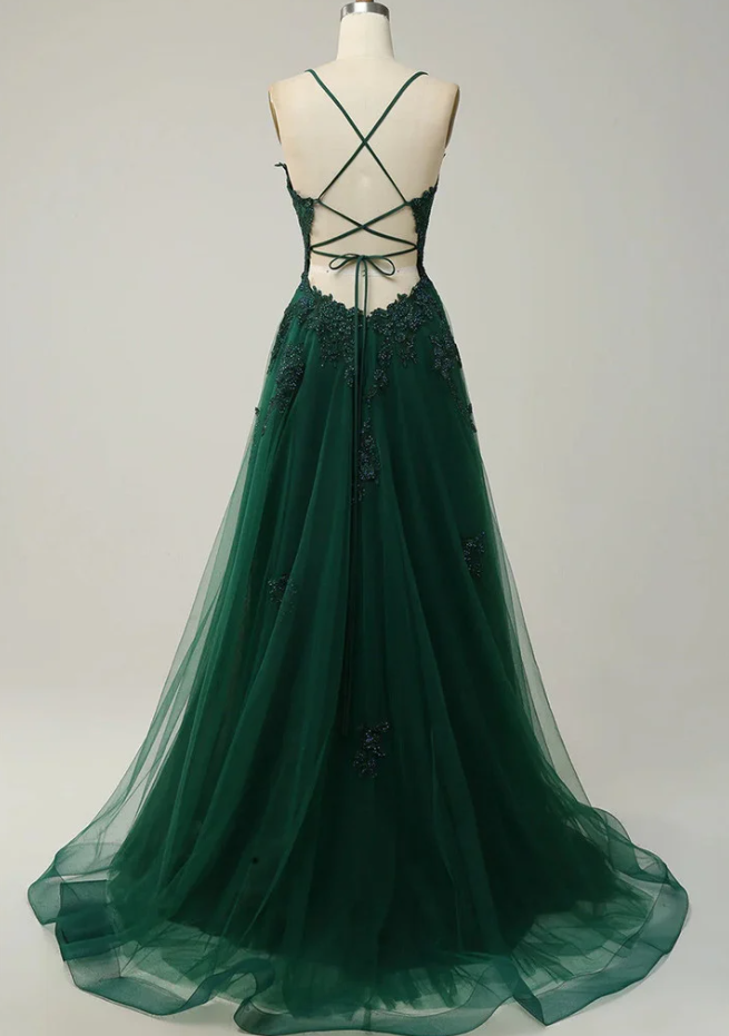 A Line Green V-neckline Tulle Prom Dress with Lace Cross Back