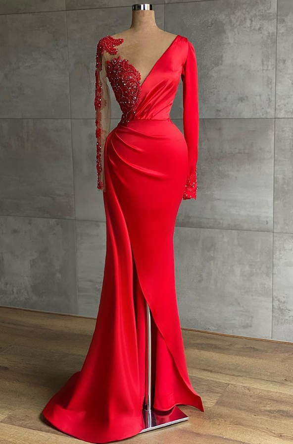 Round Neck Long Sleeves Mermaid Red Prom Dresses