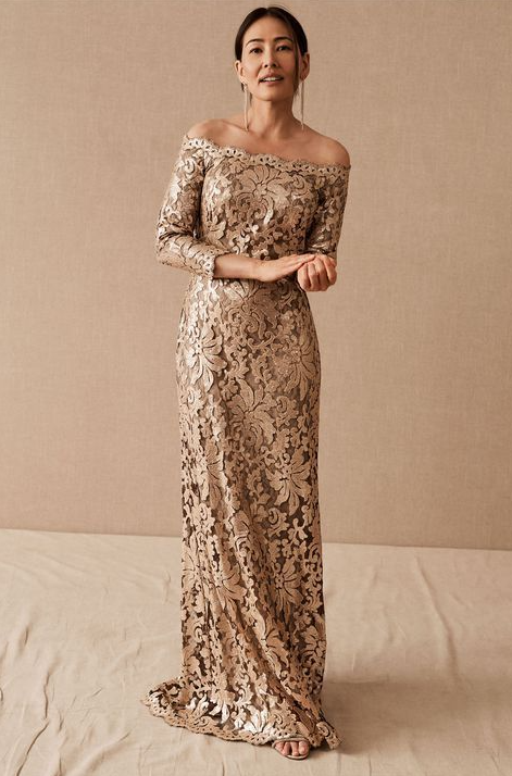 Elegant Lace Champagne Mother of Bride DressWith Long Sleeves