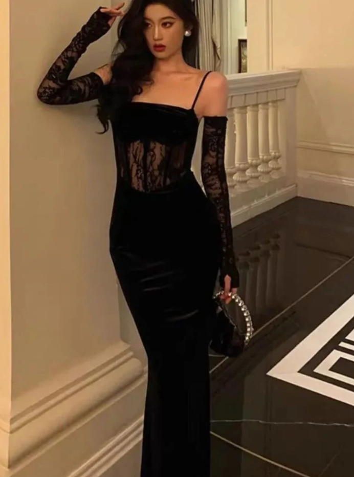 Spaghetti Straps Velvet Lace Red Evening Party Dresses